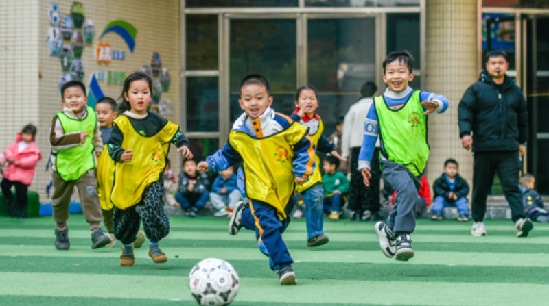 在湖南省永州市道县城东幼儿园,小朋友们在进行足球对抗赛。