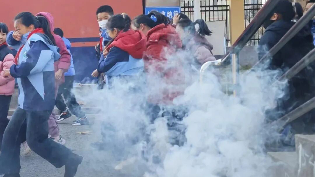 同学们在老师的带领下,用湿毛巾、衣物等捂住口鼻,弯腰低姿,沿着预定疏散路线,迅速向学校操场的安全地带集结。