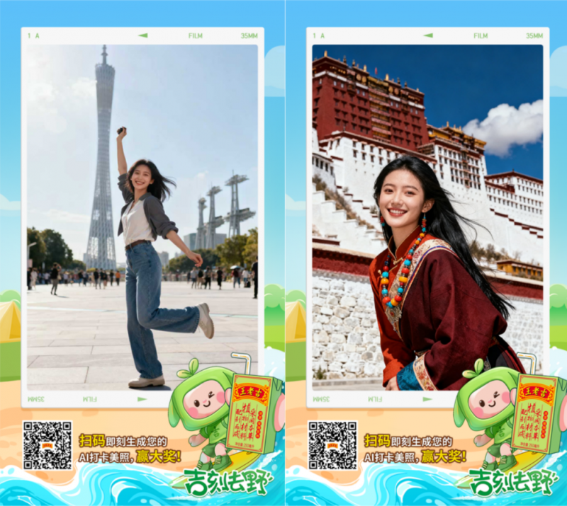 而这扇传送门的钥匙,就是这个能AI生成网红景点打卡美照的二维码。它让暂时无法远行的人,也能在精神上完成一次“去野”。用户只需在绿盒产品包装上填上“去野”心愿,拍照上传, AI便能智能合成一张心愿目的地的旅拍照片,让想象可视化,让愿望可分享。这不仅是对现实限制的一种温柔补偿,更传递出品牌的主张:无论身在何处,只要心向旷野,即刻就能在精神上出发。