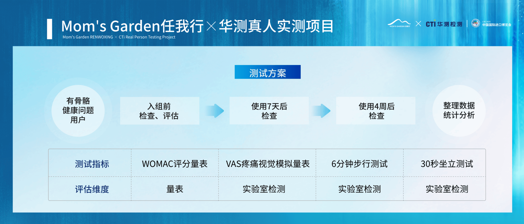华测检测食药临床评价中心商务总监张洪健女士介绍到,华测检测与Mom's Garden任我行的合作将通过系统的真人实测研究,运用“WOMAC评分量表、VAS疼痛视觉模拟量表、6分钟步行测试、30分钟坐立测试”四大专业指标,科学评估产品在实际使用中的安全性与有效性。