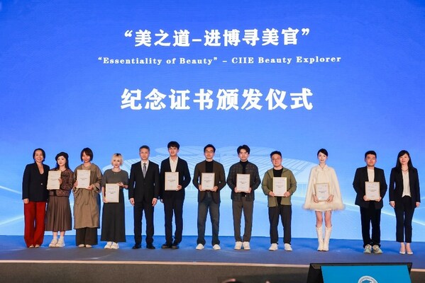 中国国际进口博览局副局长李国清、新华社上海分社党组成员金丽莉、欧莱雅北亚及中国公共事务总裁兰珍珍,共同为受欧莱雅邀请参与本次活动共创的9位创作者代表,授予"美之道—进博寻美官"纪念证书,以肯定他们在传播美与进博故事方面做出的积极贡献。