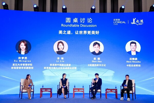 "美之道,让世界更美好"圆桌讨论于中外品牌论坛上举办。欧莱雅中国副总裁兼欧莱雅中国大众化妆品部总经理李琳,复旦大学管理学院市场营销学系副教授许梦然,知名网络读书博主赵健,以及"进击波财经"主理人、财经作家沈帅波齐聚一堂展开深度对话,共同探讨了美好消费趋势下,品牌所面临的挑战和机遇。