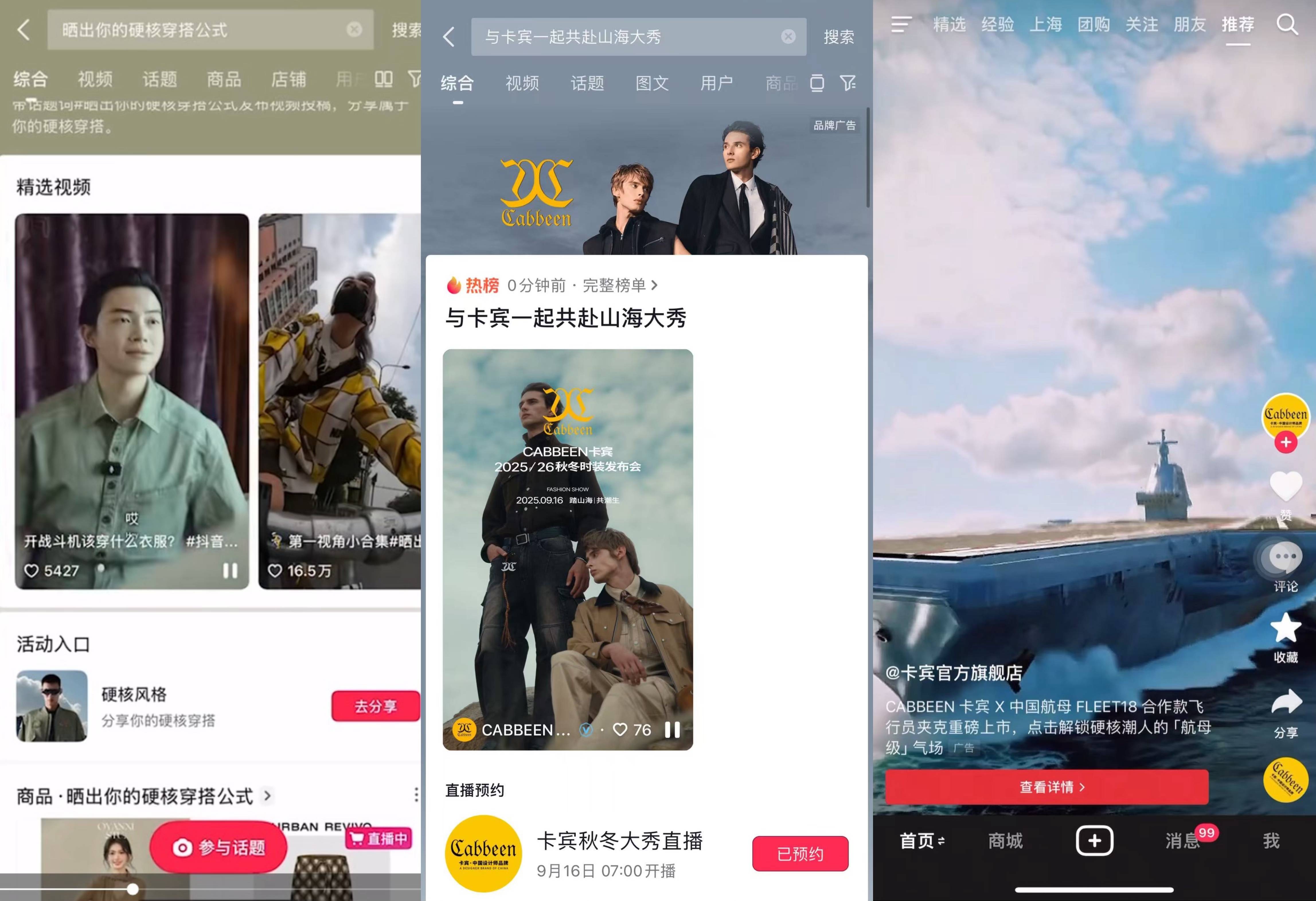 项目初期,「抖音风格实验室」为CABBEEN卡宾锁定“军事+时尚”的跨界破圈路径,联动抖音硬核财经类头部达人@直男财经,以造舰及军舰命名等军事迷关注的话题为切入点,解读联名系列设计细节的同时,传递品牌背后的家国情怀,自然完成从军事兴趣圈层到时尚消费圈层的渗透,为品牌构建起首轮用户心智认知。
