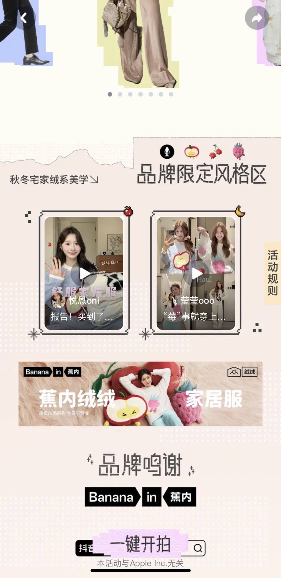 首先,「抖音风格实验室」为蕉内打造专属场景阵地——通过活动H5搭建“品牌限定风格区”,以沉浸式视频内容,将蕉内绒绒家居服的柔软质感、时尚设计与居家场景结合,直观传递“绒系美学”的核心理念,强化用户对品牌“舒适与美学兼具”的认知。