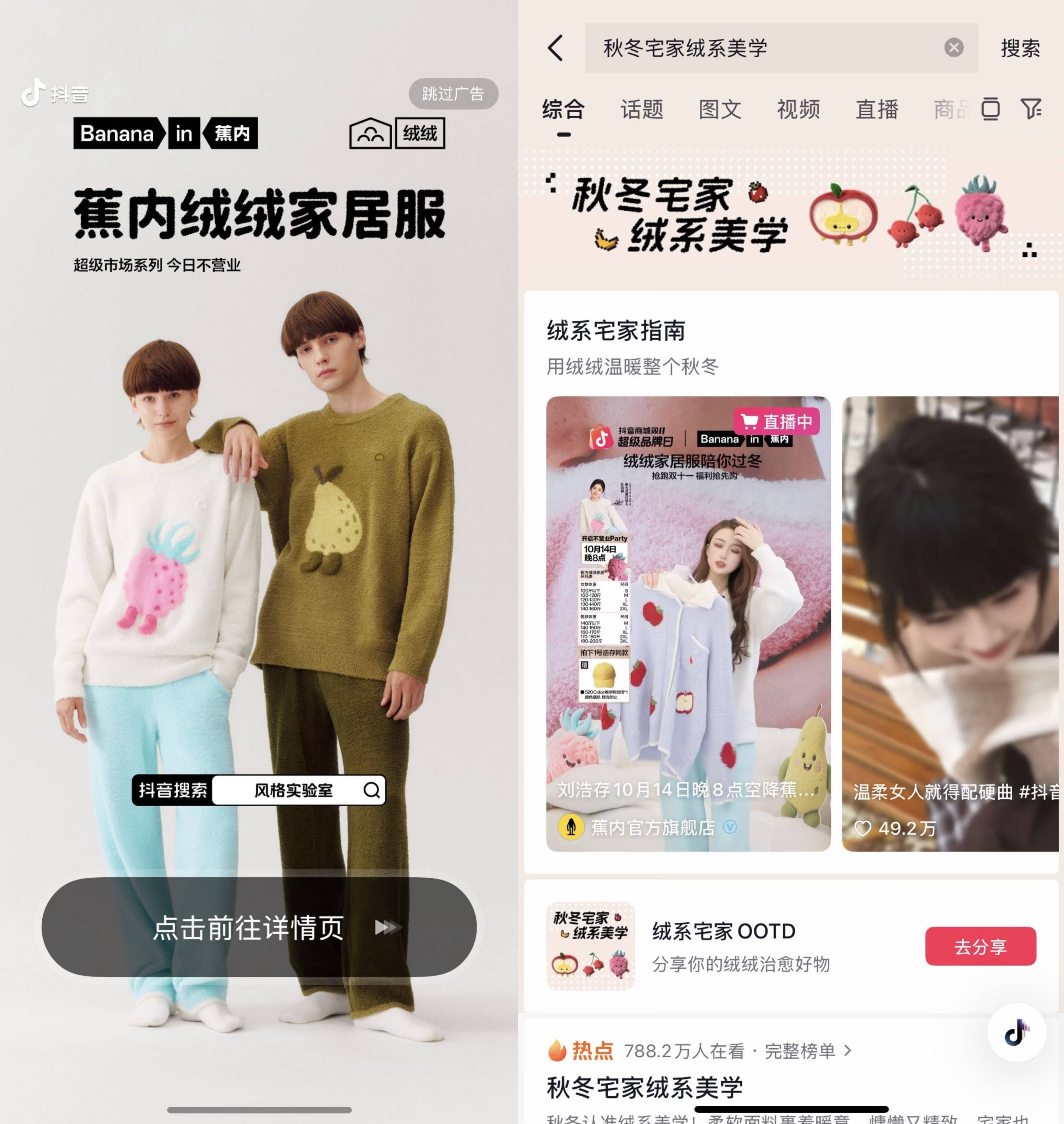 在同一阶段的风格探索中,面对秋冬保暖赛道的激烈竞争,蕉内以“秋冬宅家绒系美学”为核心主题加入「抖音风格实验室」。IP基于对用户“秋冬既要保暖,又要兼顾舒适与美感”需求的洞察,与蕉内的“体感科学”品牌定位深度契合,打造“科技感+舒适美学”的家居穿着体验,通过场景化内容构建与全链路转化设计,让品牌产品亮点精准触达需求人群,实现从趋势参与到风格引领的跨越。