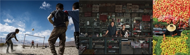 银奖作品则呈现出更广阔的地理与文化视角。《帕尔米高原的足球少年》捕捉高原上少年驰骋的动感瞬间,展现坚韧生命力;《乡村供销社》以纪实质感还原乡村生活场景,传递时代变迁中的人情温度;《丰收的苹果摊》则以饱满色彩与构图,渲染出农产品丰收的喜悦氛围。三者共同构建起从高原到村落、从个体到群体的影像叙事谱系。
