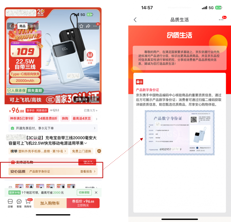 即日起,消费者在京东平台购买移动电源、燃气灶、电热水器、插座、童鞋等产品时,只需点击商品详情页上的“安心品质”标识,即可一键调取该产品的“数字身份证”,查看包含产品名称、规格型号、生产企业、执行标准、强制认证信息等在内的完整质量档案。