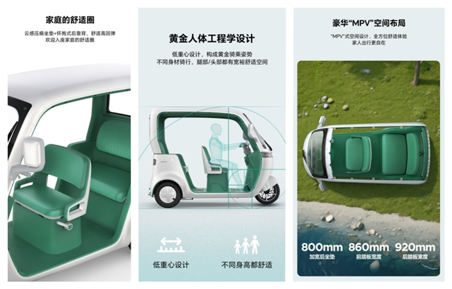 同时,随着生活水平的不断提升,广大消费者对于休闲电三轮的要求,尤其在空间方面的要求正在围绕 “使用场景”形成全新的评价体系,包括对于前后排空间腿部纵向空间、头部空间要求的提升;对于储物空间容积、几何尺寸与开关方式要求的提升;对于座椅、靠背人体工学适配性要求的提升;对于人车交互等方面智能化要求的提升。新规的出台,将促使从业企业摒弃随意改装加装超标部件以满足需求的短视行为,转而在安全基础上提升用户体验,推动产品向“安全+实用”的方向升级。而爱玛乐臻CA900正是集中体现出了这样的思路与践行,即在保持休闲电三轮的低成本与灵活便捷属性的基础上,令消费者享受到“汽车级别”的大空间、高安全性、高舒适性与智能出行体验。