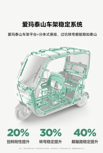 为了进一步提升车身强度并减轻振动,爱玛乐臻CA900采用了与爱玛A7系列、爱玛马赫S1 Pro等新锐两轮电动车同系列、被爱玛官方称为“移动安全堡垒”的高碳钢泰山车架平台,采用军工级高碳钢材质,通过分段式冲压工艺和几何切割设计,通过369kg超负荷破坏震动实验60万次,确保长期载重不变形,坚固程度达到汽车级别。
