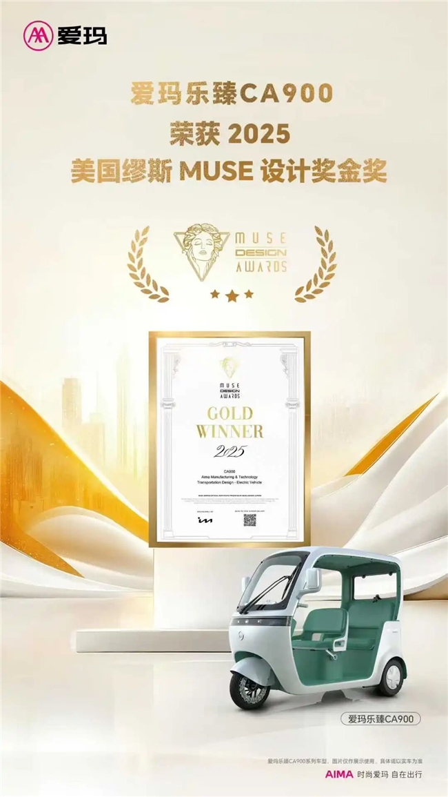 可以说,通过分析爱玛乐臻CA900的诸多升级举措,我们从中不难看出,作为电动车行业头部品牌,爱玛科技正是抓住了细分市场新规与消费者需求的“痛点”,凭借其强大的研发实力与深厚的造车积淀,以设计汽车的思路对休闲电三轮进行“升维”。在2025年美国MUSE设计奖评奖中,爱玛乐臻CA900更从全球100个国家的超过4万件作品中脱颖而出斩获金奖,在进一步展现出细分市场“新物种”的硬核实力的同时,再次树立了休闲电三轮品类的未来发展标杆。我们有理由相信,在这样的标杆产品带动下,休闲电三轮市场将彻底告别此前“以超标参数低价抢市场”的无序竞争,实现更加健康有序地良性发展。