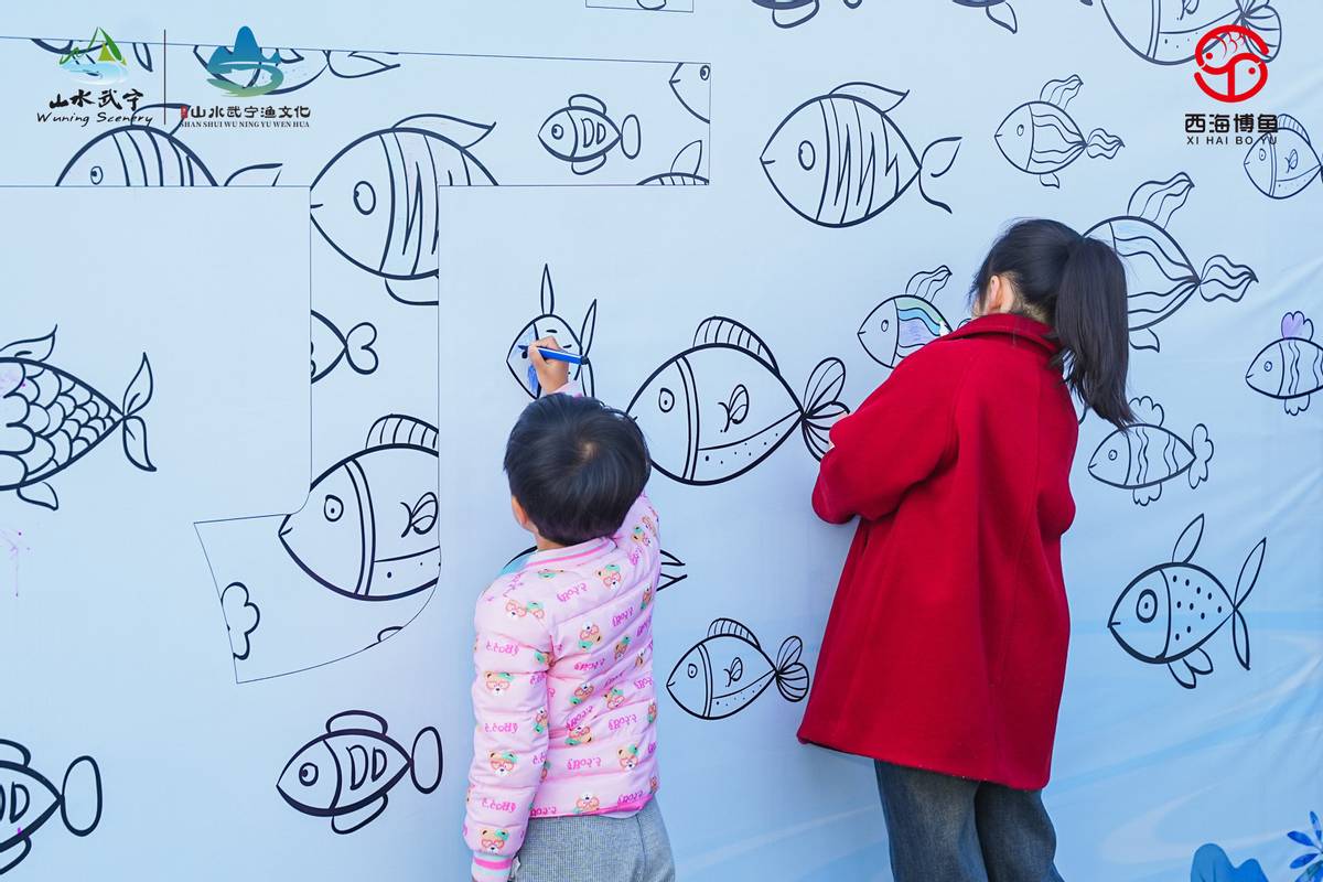 (儿童在主题墙前彩绘鱼群)