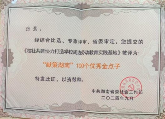▲《校社共建协力打造学校周边劳动教育实践基地》入选湖南省“献策湖南”100个优秀金点子证书