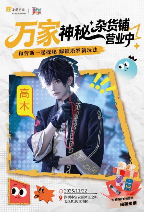 “欢迎来到万家维多利亚神秘学杂货铺,恭喜您升级成为探索者,现赠予您魔力补给包,愿月光与您同在。”11月22日,步入位于深圳“湾区之眼”的华润万家的快闪活动展位,人气coser正在为观众抽取角色卡牌并送出惊喜礼包。人气coser互动、美食试吃、儿童彩绘……一场集趣味、潮流与美食于一体的沉浸式消费体验在这里开启,带来连连趣味。即日起至次年1月31日,“万家维多利亚神秘学杂货铺”持续营业,为市民带来惊喜与欢乐。