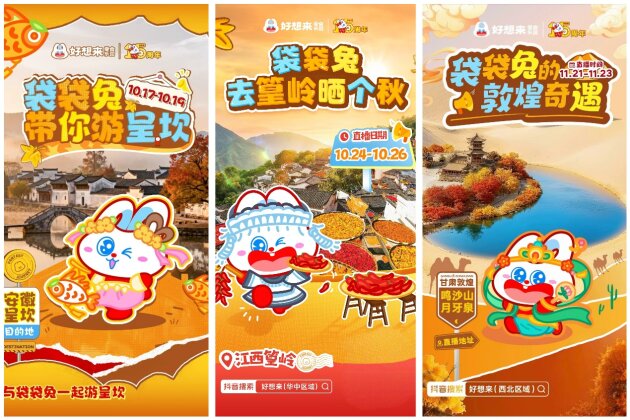 在婺源晒秋场,好想来也将当地晒秋女的造型复刻进直播间,通过航拍、云游等方式,把好想来与袋袋兔的品牌形象融入山水之间,自然而然植入“出游吃零食,就逛好想来”的消费心智,使品牌于无形中进一步扩大影响力。
