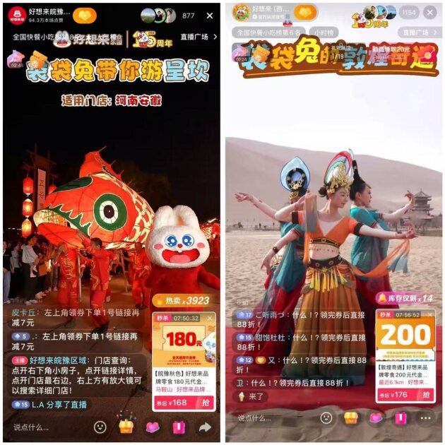 活动从10月初开始,横跨秋冬两季,从浪漫之城珠海到广袤的敦煌大漠,再到初冬的北国风光,通过直播间展现祖国大好河山的同时,也依托好想来遍布全国的超15000家门店,为消费者带来极具性价比的代金券和秒杀商品。