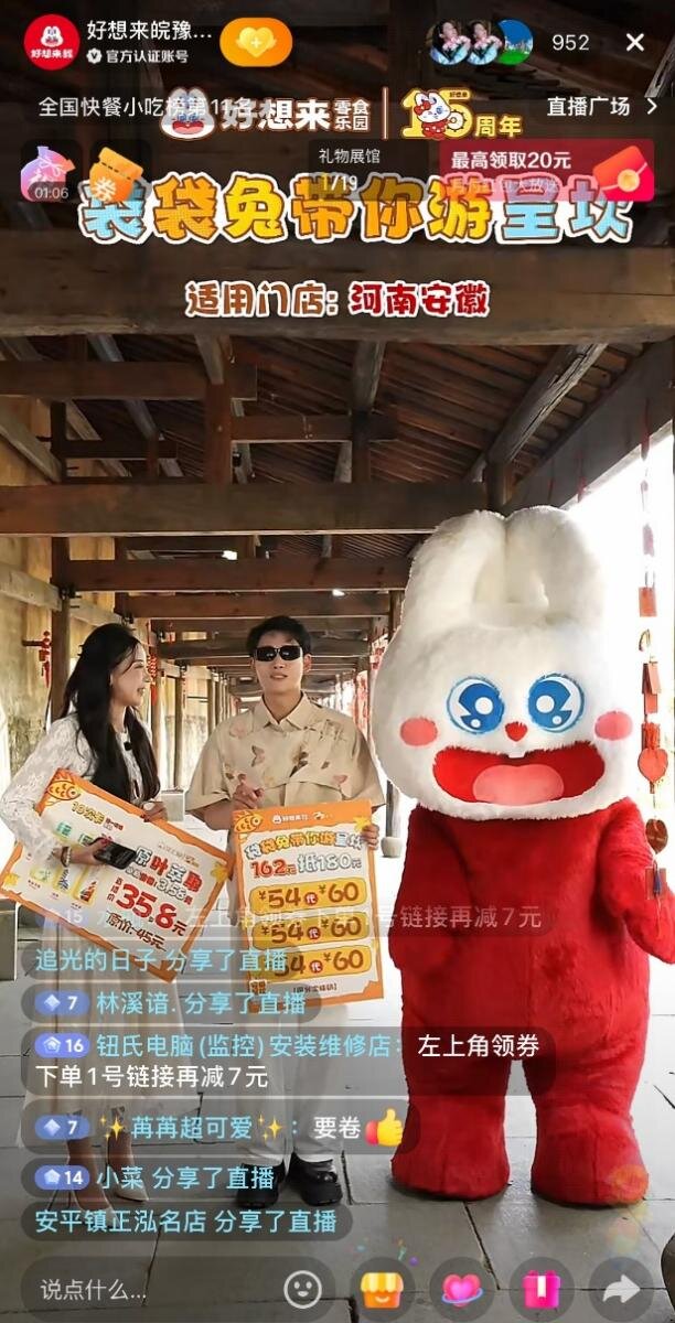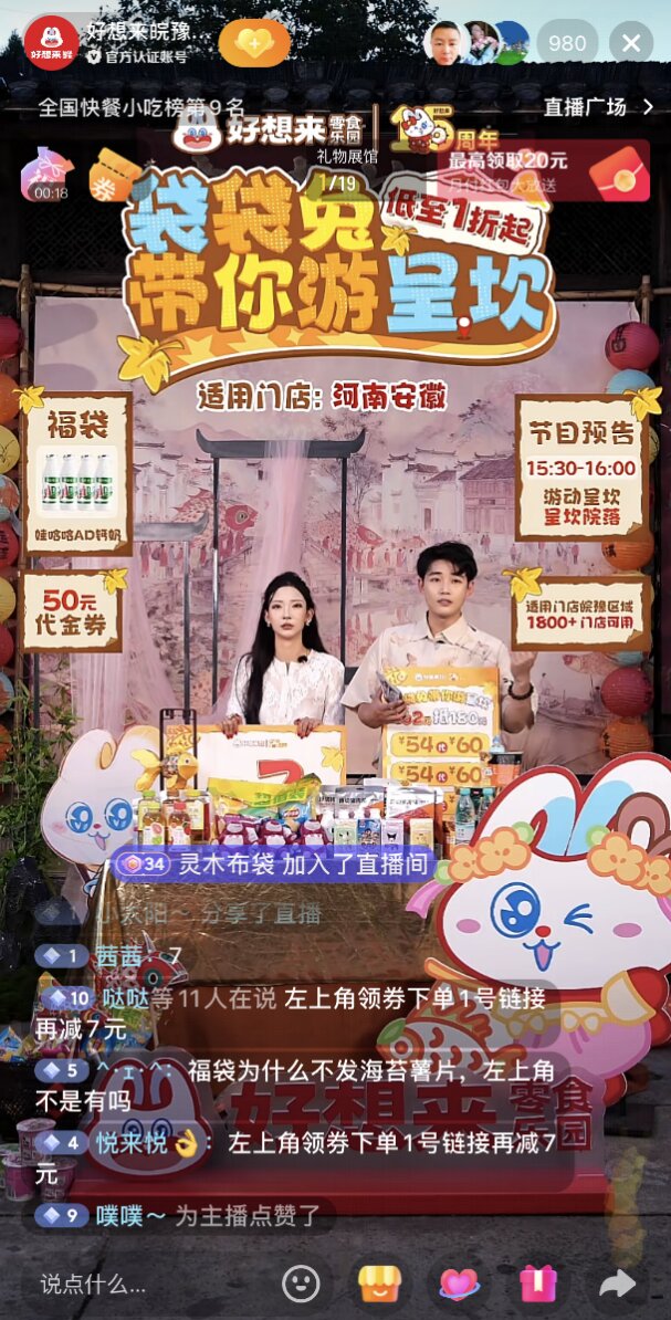 在此背景下,万辰集团旗下量贩零食品牌好想来零食乐园(以下简称“好想来”)在十五周年之际,抓住文旅市场新机遇,推出“袋袋兔的奇妙秋游”直播活动,将直播间搬到多个特色文旅目的地,创新出“零食+文旅”的融合直播新模式。