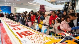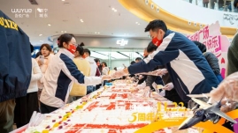 11月22日下午,吾悦广场中庭推出长达十米的巨型庆典蛋糕,面向全城顾客免费分享。现场排队有序,市民纷纷拍照记录,共享甜蜜时刻。蛋糕切割仪式由商场负责人与顾客代表共同完成,象征吾悦与西宁市民五载同行的温馨情谊。