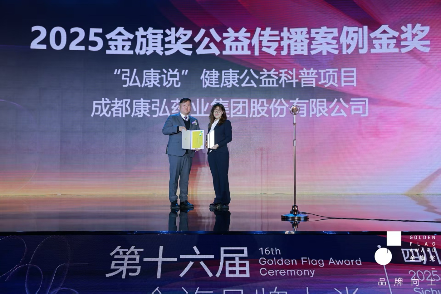 会上,2025金旗奖榜单正式揭晓。康弘药业在众多参评的品牌案例中脱颖而出,凭借“弘康说”健康公益科普项目,获评“2025金旗奖公益传播案例金奖”。