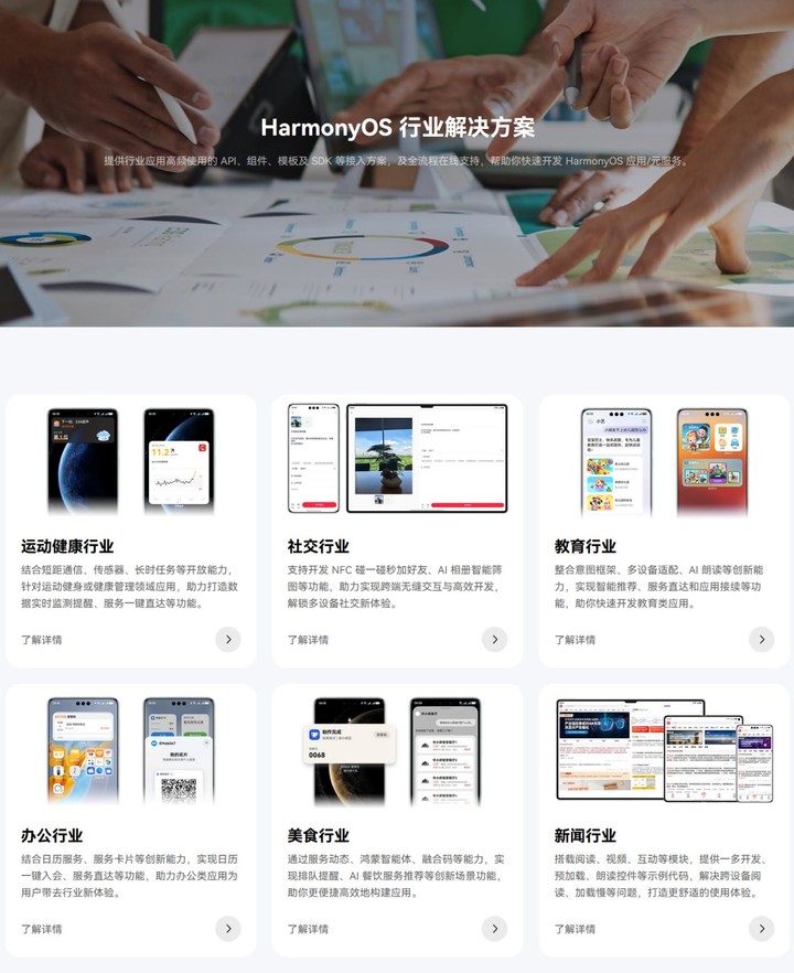 常规应用开发往往耗时耗力,重复性工作多。对此,华为将开发高频使用的API、组件、模板及SDK等进行系统化整合,形成了包括运动健康、社交、教育、办公、零售等15+行业的解决方案,未来还将不断扩展。这些解决方案将对行业应用开发提供全流程技术指导及开放能力支持。
