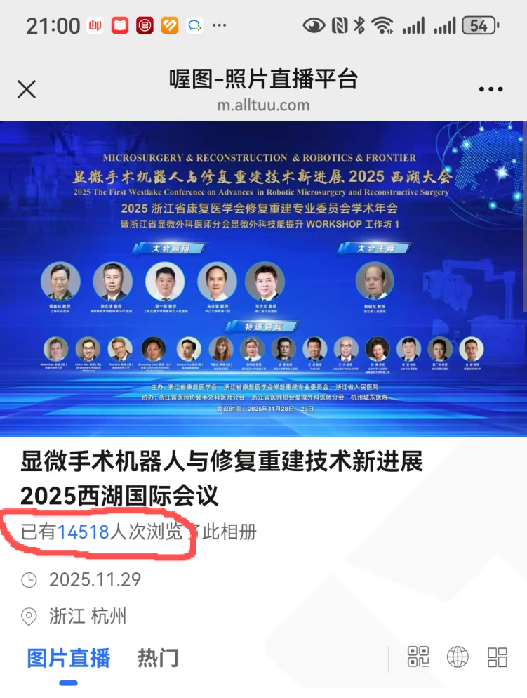 2025年11月28-29日,由浙江省康复医学会、浙江省康复医学会修复重建专业委员会、浙江省人民医院联合主办,浙江省医师协会手外科医师分会、浙江省医师协会显微外科医师分会、杭州城东医院共同协办的“显微手术机器人与修复重建技术新进展·2025西湖国际会议暨2025年浙江省康复医学会修复重建专业委员会学术年会”在浙江杭州海外海酒店如期举行,期间也举办了“浙江省手外科医师分会摄影大赛决赛”和“浙江省显微外科医师分会显微技能提升Workshop工作坊”等。本次会议围绕显微手术机器人技术的前沿动态和修复重建技术的创新与进展,展开了为期两天的高密度、高水平学术交流,现场气氛热烈,成果丰硕。