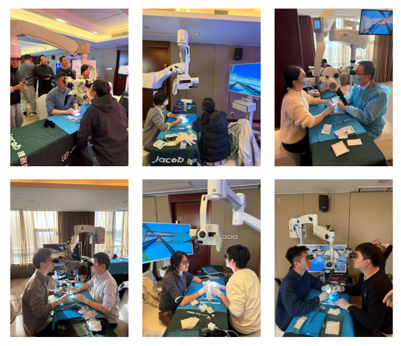本次会议的另一亮点是由浙江省显微外科医师分会举办的“显微技能提升Workshop工作坊”。来自上海及全省各地的16名学员依次在显微镜下练习缝合0.25mm人工血管、200g大鼠尾动脉以及30g小鼠尾动脉,逐步递进的提升显微外科技能水平。在培训过程中,学员们展现出了极高的学习热情,对待每一个操作练习都格外认真。无论是器械的使用、还是显微缝合的技巧,学员们都投入了极大的热情和精力,力求在有限的时间内掌握更多的知识和技能,并在显微镜下展现出更规范精准的操作。同时,2025全国超显微吻合大赛一等奖获得者——台州恩泽医院的王成教授与顾仕林教授现场演示了精彩的“针尖上的舞蹈”,进行了0.2mm小鼠尾动脉的超显微血管吻合秀,两位老师精湛的显微外科技术获得了参会学员的持久热烈掌声。吴建龙博士与方仁鹏博士则展示了备受关注的dcLVA大鼠手术模型的操作演示,为相应的基础科研开展提供了有力的参考。学员们经过两个下午的刻苦操练下,在朱孜冠、卢鸿瑞、柳琪、王亮等老师的专业指导下,顺利通过了操作考核。