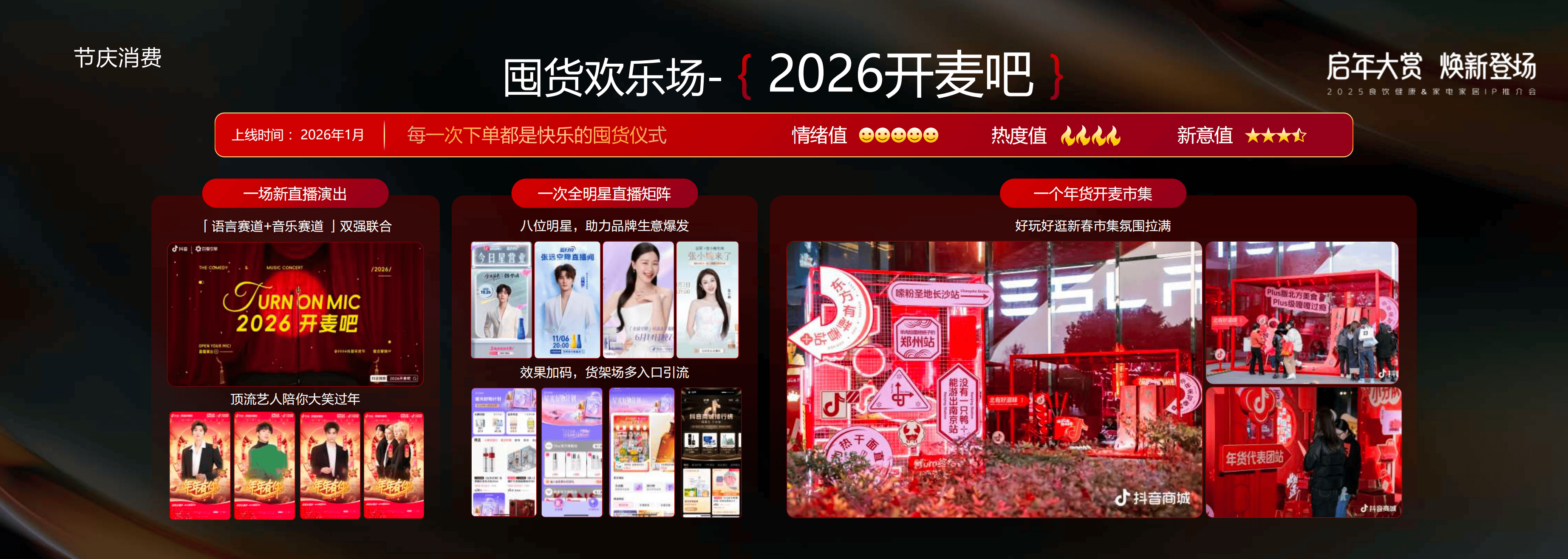 针对年轻人的喜好,抖音将在春节期间推出多个既有好东西、好价格又有欢乐好体验的IP项目,满足用户边玩边买的诉求。例如,抖音电商年货节将推出「2026开麦吧」IP,邀请喜剧界、音乐界的顶流艺人一起陪大家大笑过年,并且会进入品牌直播间陪大家一起挑选年货,让每一次下单都是快乐的囤货仪式。此外,抖音本地生活服务将推出「新春吃喝玩乐节」,邀请100个以上的明星达人一起走出家门展开一场全国范围的吃喝玩乐狂欢,抖音将在全国50多个重点城市设立线下欢乐场,和各地庙会结合起来提供热闹年味和丰富体验,将为本地商家带来巨大流量机会。