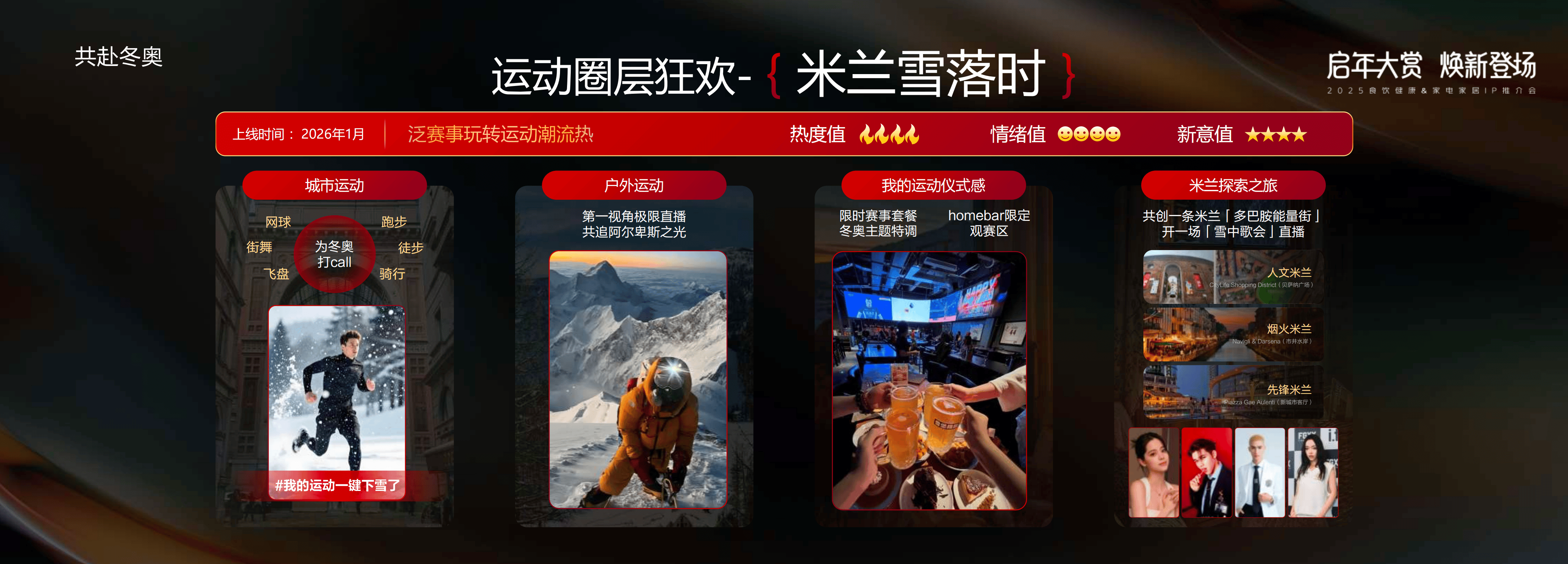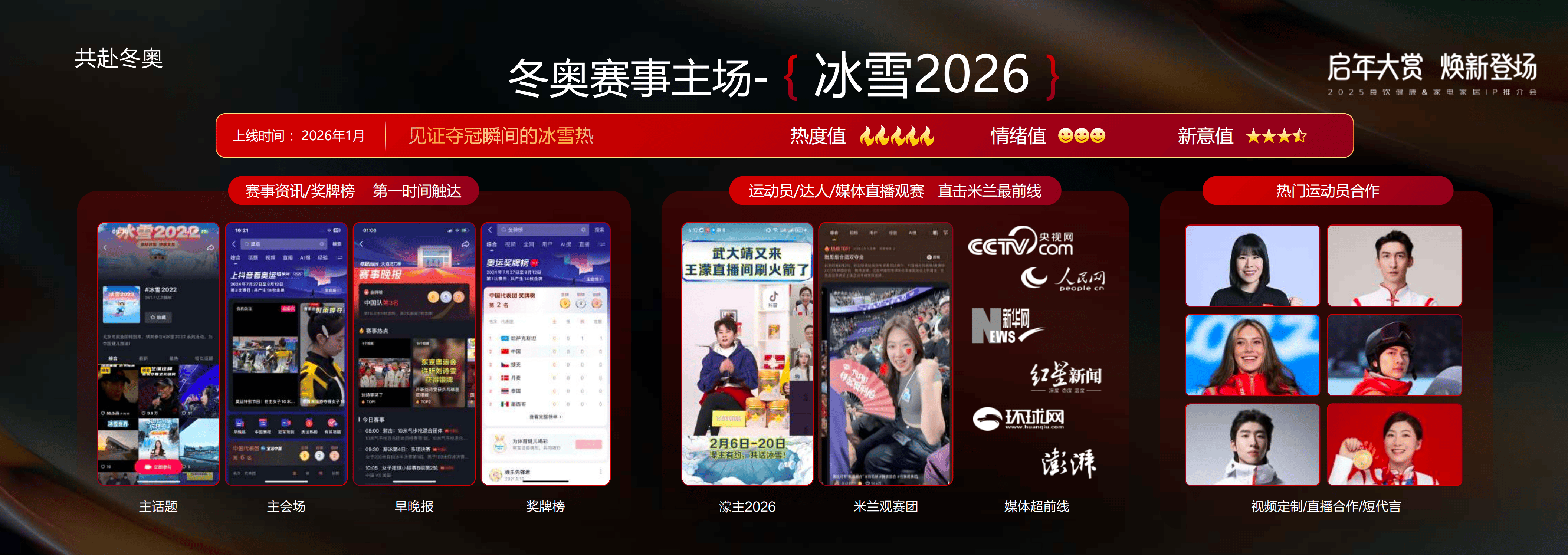 最后,马年春节还有一个大彩蛋,就是春节期间也恰逢米兰冬奥会举行,顶级体育赛事的话题热度、情绪浓度将与春节叠加,双顶流相遇将带来更具爆发力的情绪场景。
