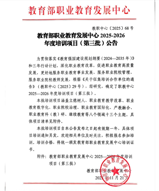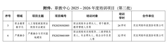 近日,教育部职业教育发展中心公布《教育部职业教育发展中心2025-2026年度培训项目(第三批)》。由用友网络承办的人工智能赋能职业院校专业建设和产教融合与实训基地建设两个项目成功入选。