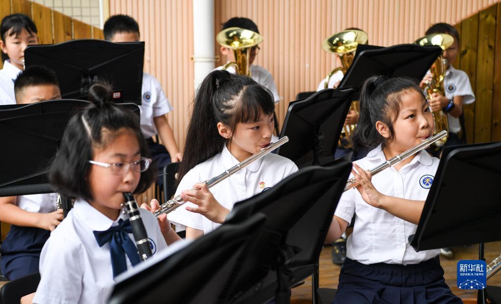 8月30日,重庆市南岸区天台岗雅居乐小学管乐团成员为前来报到的学生和家长演奏乐曲。