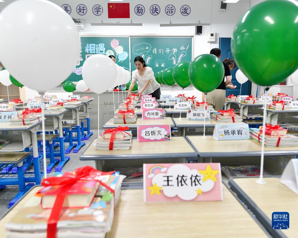 8月30日,教师在浙江省建德市明镜小学一年级的教室里布置,为开学营造温馨的环境。
