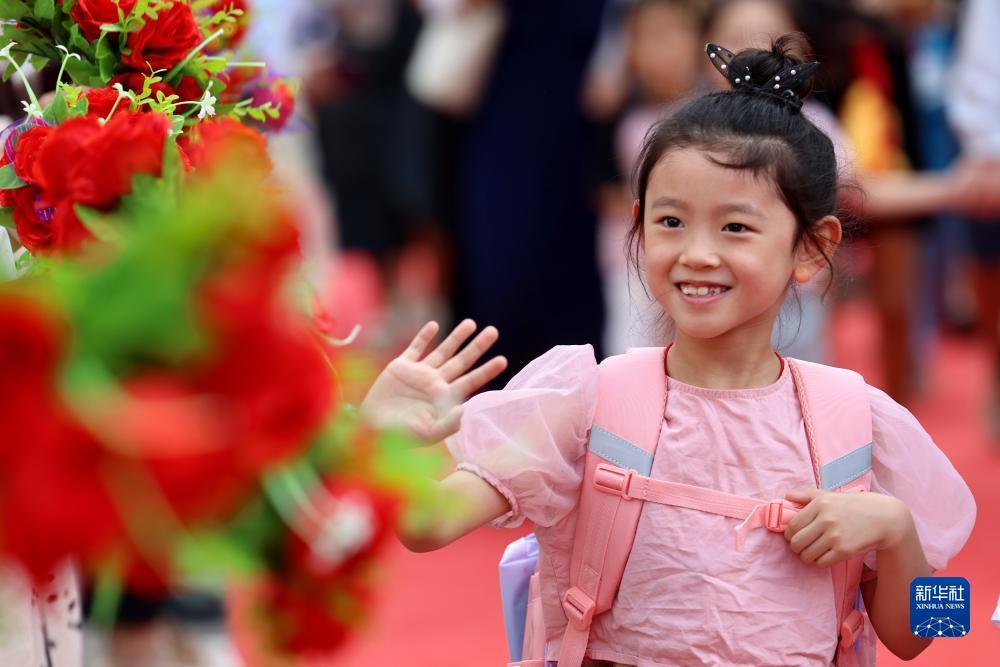 8月30日,在山东省枣庄市市中区东湖小学,一名一年级新生向迎接他们的老师挥手致意。
