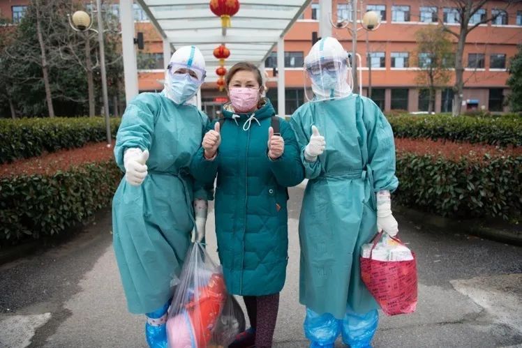 3月3日,汉口医院内,两位护士送一位患者出院。