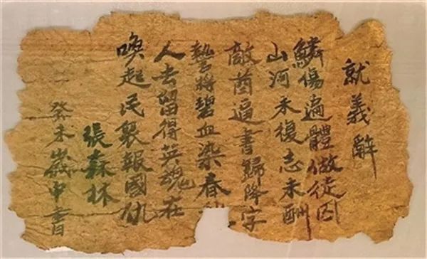 张森林牺牲后,尸体由高老白、高年、高志等村民连夜从段庄偷运回村,用清水洗净周身的血痕,从他的内衣袋中发现了这封《就义辞》——
