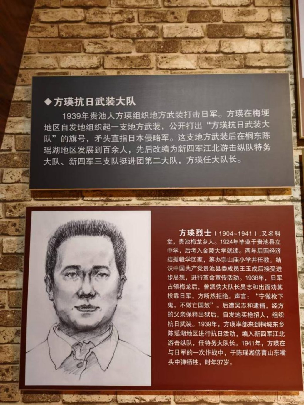 池州烈士纪念馆内陈列的方瑛烈士画像及事迹。(受访者供图)