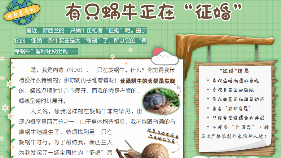 最近,新西兰的一只蜗牛正忙着“征婚”呢。由于它的“征婚”条件实在是太“苛刻”了,所以它的“有缘蜗牛”暂时还没出现。快来本报瞧瞧它的“征婚”信息,没准你身边有它的“有缘蜗牛”呢!