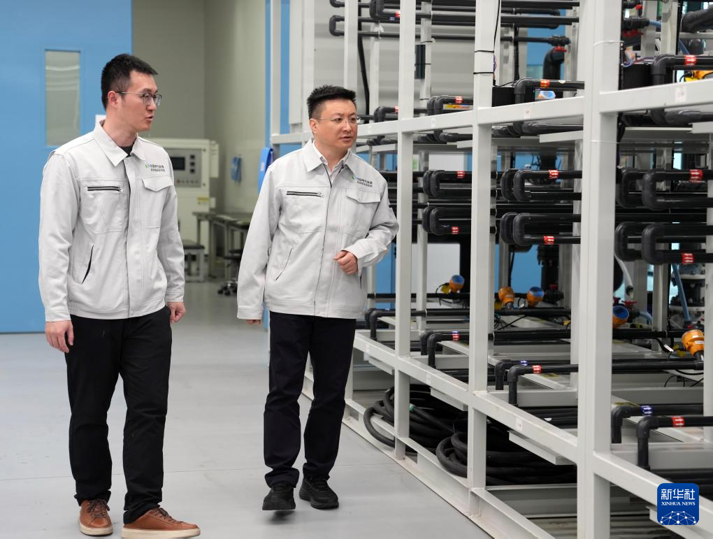 1月27日,在中国电气装备集团上海科研基地,张帆(右)在调研液流电池实验平台的研发情况。