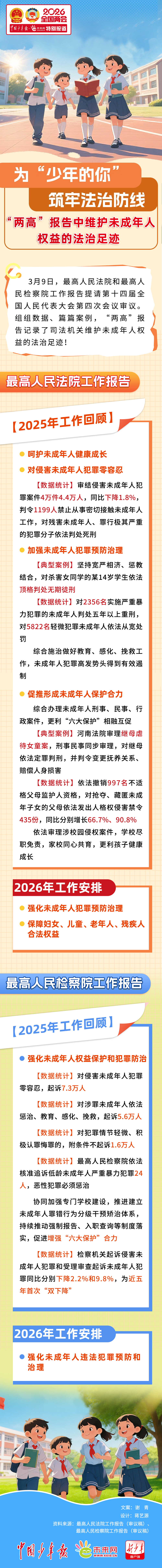中国少年报·未来网北京3月9日电(记者 谢青 蒋艺源)3月9日,最高人民法院和最高人民检察院工作报告提请第十四届全国人民代表大会第四次会议审议。组组数据、篇篇案例,“两高”报告记录了司法机关维护未成年人权益的法治足迹!