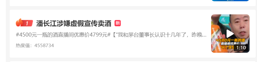 在媒体对潘长江的此次直播进行报道后,“潘长江涉嫌虚假宣传卖酒”的话题一度冲上了新浪微博热搜第一。