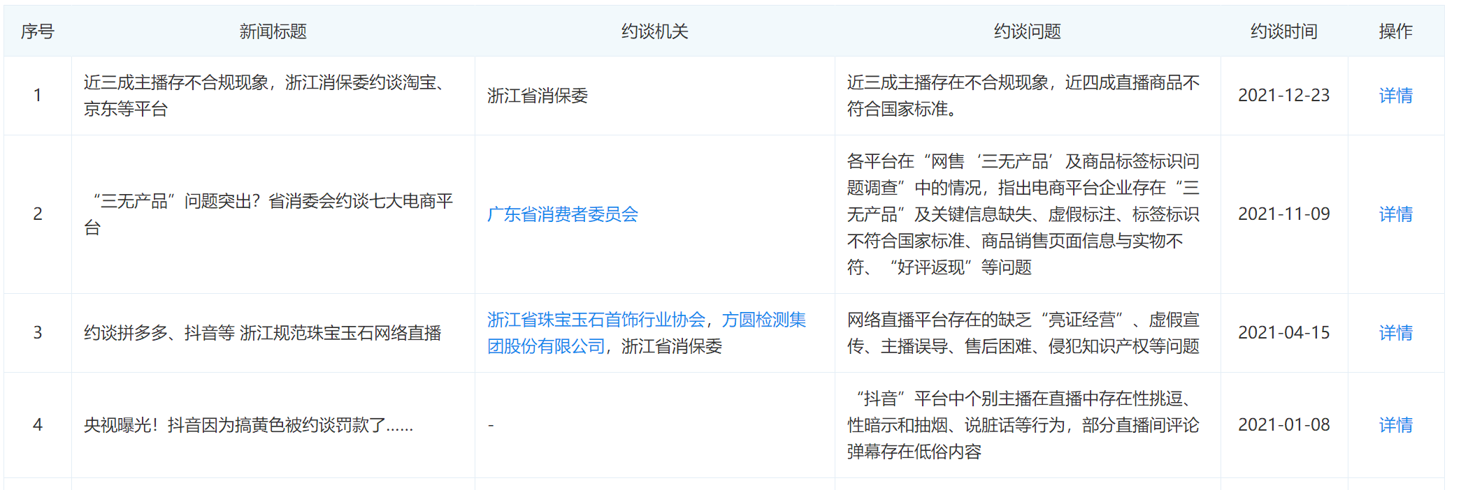 据企查查统计显示,去年12月23日,抖音等直播平台因直播商品不符合国家标准等被浙江省消保委约谈;去年11月9日,抖音等直播平台因存在“三无产品”及关键信息缺失、虚假标注等问题被广东省消费者委员会约谈。