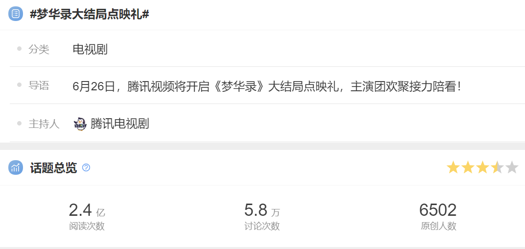 随后,#梦华录大结局点映礼#登上微博热搜,迅速引起了网友的热议,截至记者发稿,该话题收获了将近2.4亿次阅读和5.8万的讨论。