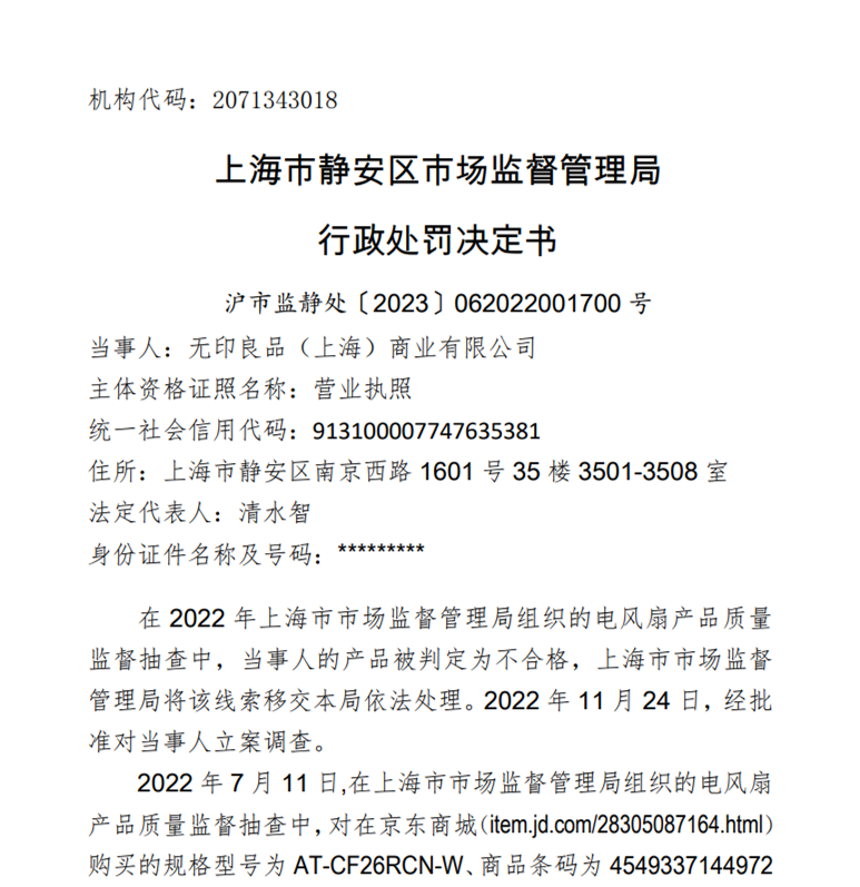 行政处罚决定书显示,2022年7月11日,在上海市市场监督管理局组织的电风扇产品质量监督抽查中,对在京东商城购买的规格型号为“AT-CF26RCN-W”、商品条码为“4549337144972”的“MUJI無印良品品牌空气循环风扇”进行抽样检验。该产品标识中明示产品质量责任承担者为无印良品(上海)商业有限公司。