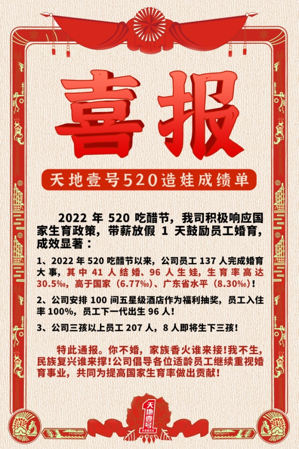 5月18日,天地壹号发布的 “造娃成绩单”公布了自2022年“520吃醋节”鼓励员工婚育以来取得的显著成果:“员工生育率高达30.5‰,高于国家(6.77‰)、广东省水平(8.30‰)!”
