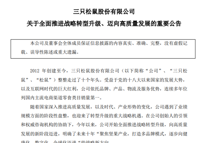 2022年4月,三只松鼠发布《关于全面推进战略转型升级、迈向高质量发展的重要公告》,其中明确了未来十年“聚焦坚果产业,优化 SKU,打造多品牌模式,逐步向健康化、数字化、全球化迈进”的战略新方向。