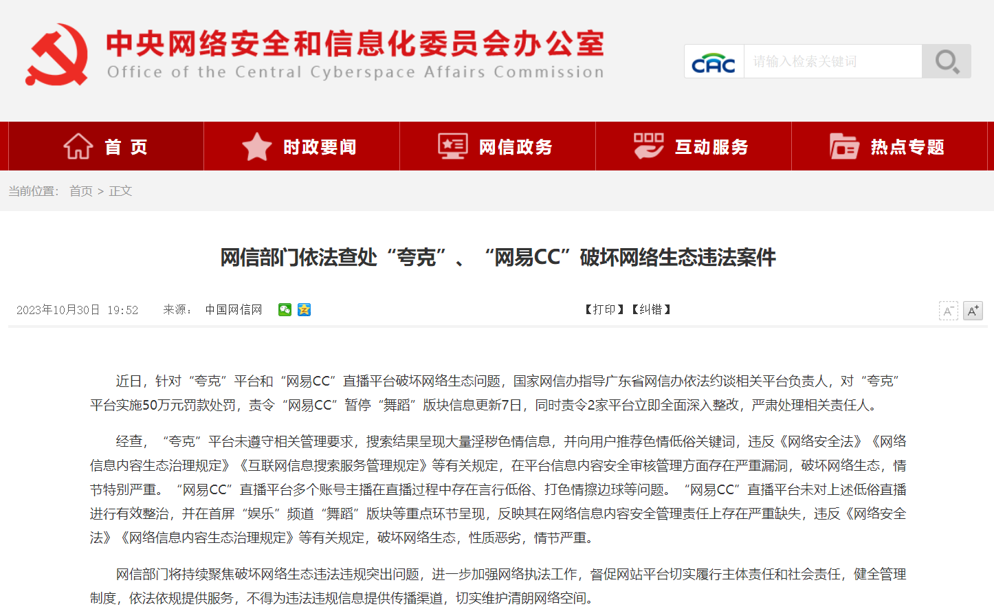 中央网信办官方网站截图