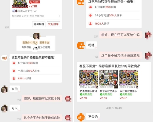 然而,记者以买家的身份和其中几家销量比较高的店铺进行了对话。当记者询问商家现在是否还可以购买“炸包”时,商家均表示可以拍下,并没有收到网店不可以售卖的通知。此外,他们均认为“炸包”不会对孩子造成危险,只要不食用,注意不溅到眼睛即可。