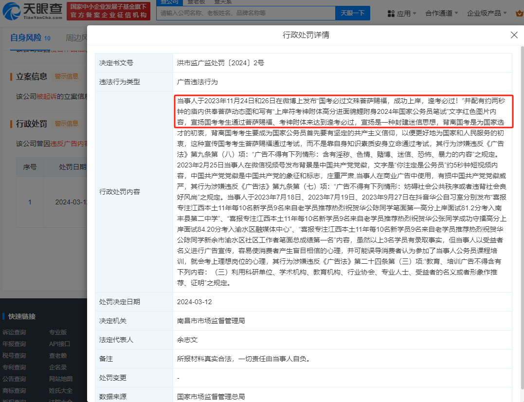 天眼查显示,当事人江西省华公人力资源有限公司于2023年11月24日和26日在微博上发布“国考必过文殊菩萨赐福,成功上岸,逢考必过!”并配有约两秒钟的庙内供奉菩萨动态图和写有“上岸符考神附体高分进面锦鲤附身2024年国家公务员笔试”文字图片内容。其行为涉嫌违反《广告法》。