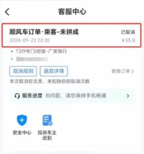 刘女士在网络公开的订单详情显示,其下订单接车时间为9月23日23时30分,自北京首都机场T2(9号门)对面-广发银行上车,订单显示为“已取消”状态,且平台判定刘女士并不需要承担责任。