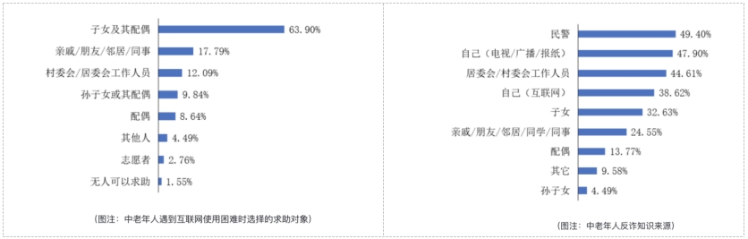 然而,调查发现,当遇到互联网使用困难时,中老年人主要求助于家人亲友,反诈知识的获取也主要来自于民警、居委会/村委会工作人员、子女亲朋等传统渠道,中老年人线上学习仍有较大的拓展空间。其重要原因在于,现有适老数字技能、网络安全知识等内容供给不足且渠道相对局限,中老年人本身用网能力相对较低,想学但找不到、找到了但看不懂的情况较多。