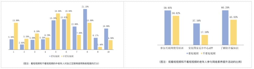 调查数据证实,适度使用短视频对中老年人网络素养提升确有积极作用。在互联网使用熟练程度上,观看短视频的中老年人自评均分为6.38,高于不看短视频的中老年人的均分5.10。与此同时,观看短视频的老年人比不看短视频的老年人参与互联网使用培训、安装国家反诈中心APP以及多渠道了解诈骗知识的比例更高,提升自身网络素养的态度更积极。