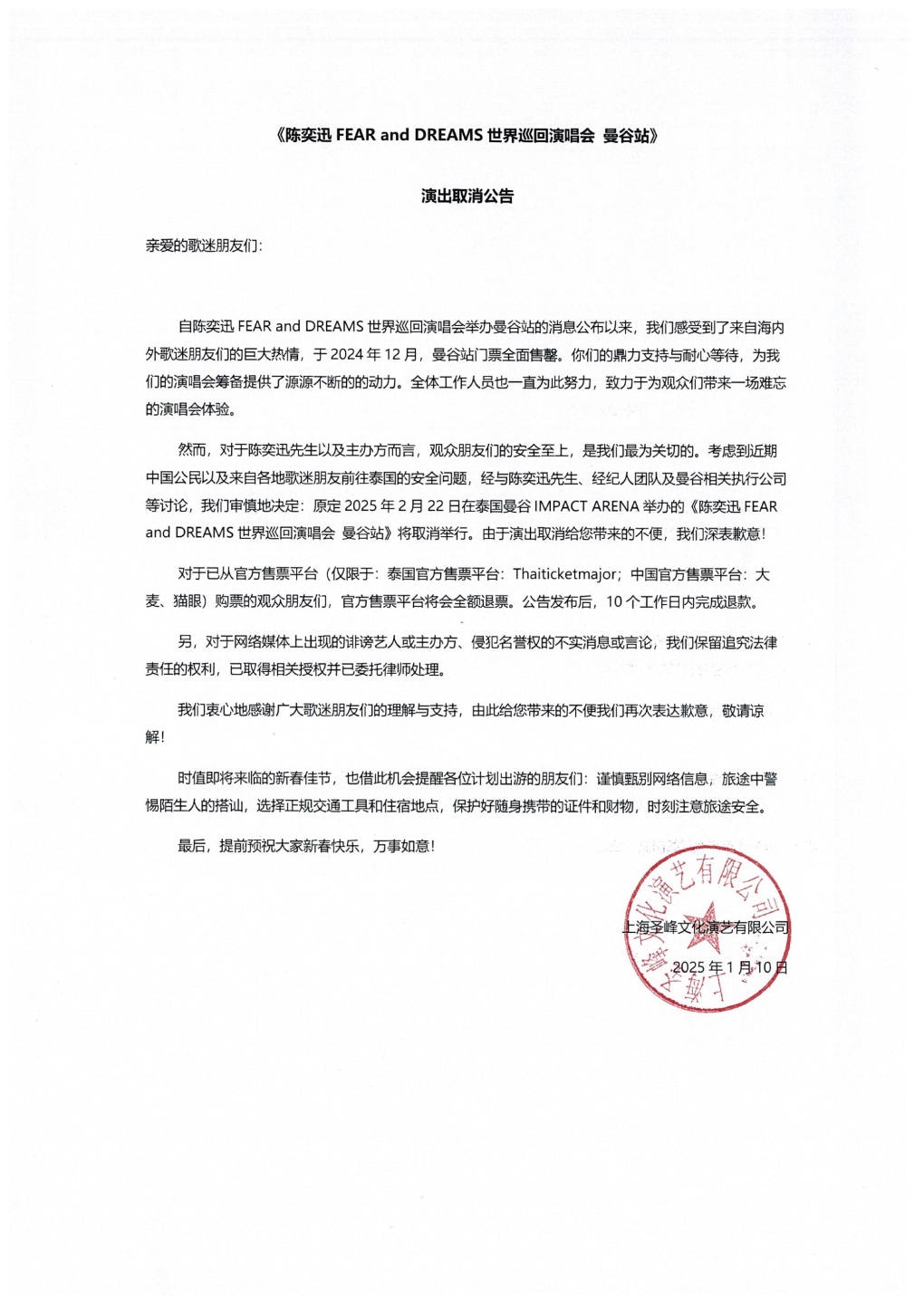 与此同时,上海圣峰文化演艺有限公司也于1月10日发布公告称,歌手陈奕迅的“FEAR and DREAMS 世界巡回演唱会 曼谷站”取消。公告称,“考虑到近期中国公民以及来自各地歌迷朋友前往泰国的安全问题,演唱会将取消举行。”
